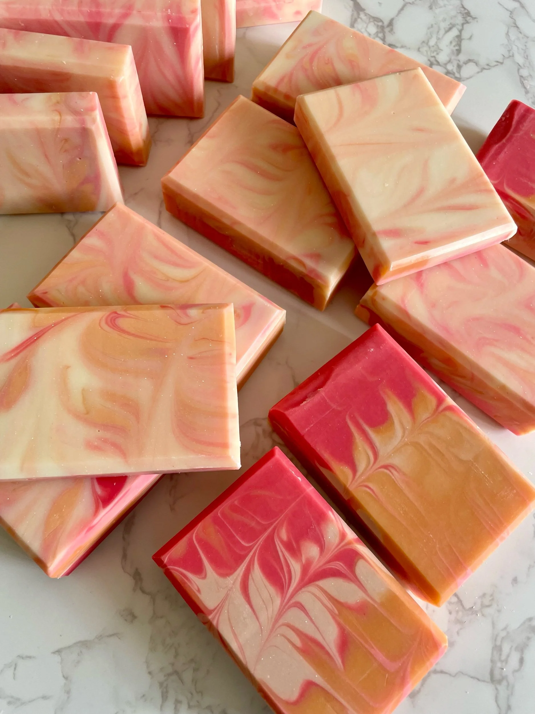 Yuzu Blossom Soap — A smooth raspberry-toned bar with a rich, velvety hue that feels both bright and elegant. Sparkling yuzu cuts through the sweetness with a crisp citrus edge, while soft blossom notes drift underneath like petals warmed by sunlight.